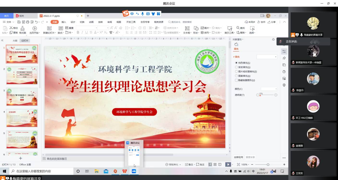 2022年3月18日,环境科学与工程学院通过腾讯会议在线上召开了研究生学生会、本科生学生会思想理论学习会。本次会议由主席团、部长团、辩论队以及爱心公益服务队各队长共同参与。