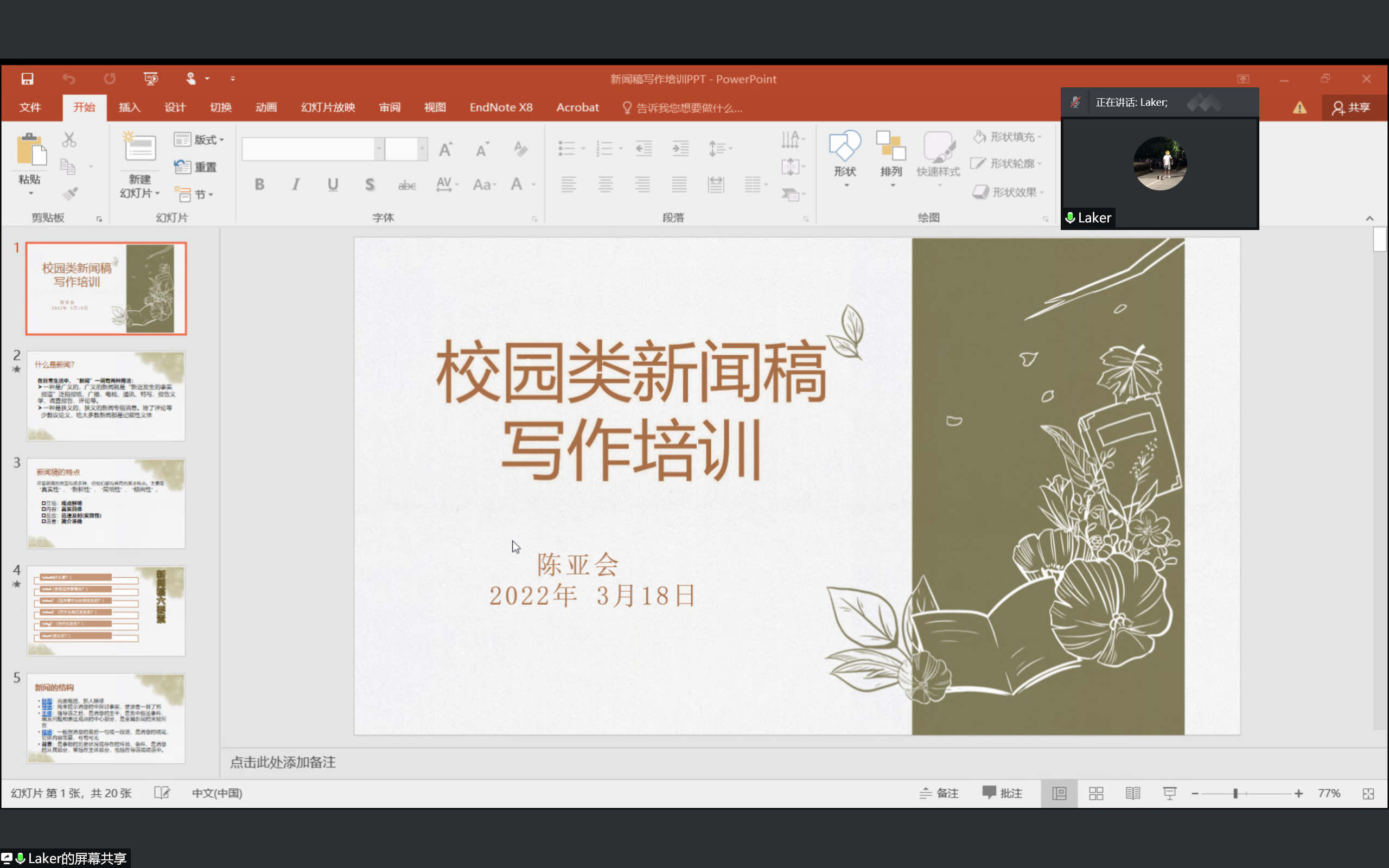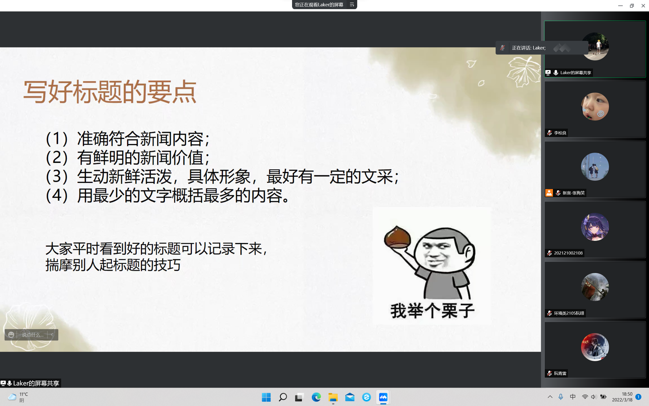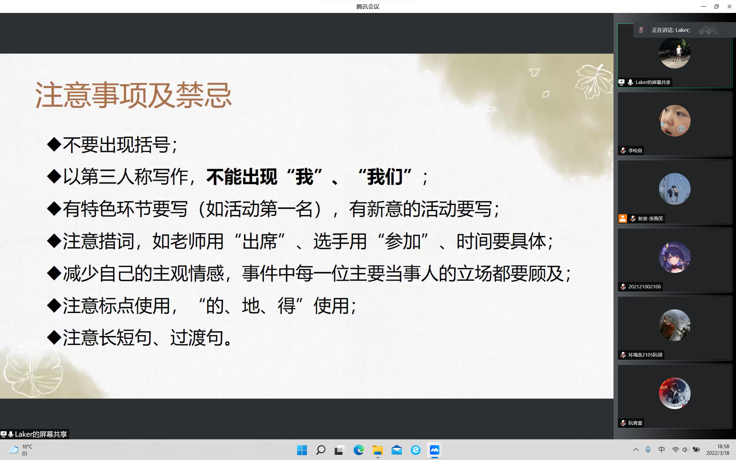 3月18日晚,伟德betvlctor1946源于英国学生会通过腾讯会议开展校园类新闻稿写作培训活动,学院21级辅导员陈亚会老师受邀作为此次活动主讲人,全体学生会成员共同参与。