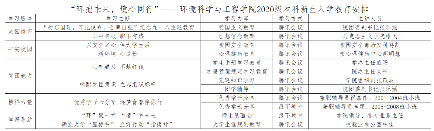 结合学校“爱与服务”的工作理念和我院“热爱环保事业、专业知识扎实、综合素质高的创新创业型优秀人才”培养目标,此次入学教育将通过线上线下相结合的方式从家国情怀、平安校园、党团魅力、榜样力量、学涯导航五个版块开展“环抱未来,境心同行”系列入学教育,旨在指导和帮助新生入学后能够尽快适应新环境、顺利完成角色过渡、科学规划学习生活,为大学生活奠定坚实基础。