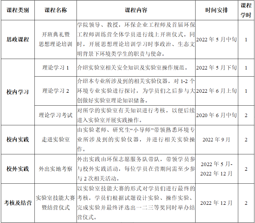为践行“两山理论”,切实提高我院学子的科研素养、科创精神和实践能力。环境科学与工程学院环保工程师训练营在院党委的领导以及院团委的指导下,整合校内外资源,对学生创新精神与研究能力、实验室操作能力进行培养。依托优势学科和校内外研发实践基地等,强化学科研究与人才培养。通过环保工程师训练营开设系列课程,一方面通过理论培训,让学生熟知《习近平生态文明思想》、“两山理论”、新发展理念、实验室安全知识、实验室操作规范等。另一方面,通过实践操作,让学生进入实验室,跟随专业老师、研究生“小导师”等动手实验,加强学生动手操作能力及科研素养。为未来我院培养更多环保工程师,为我国环保事业培养更多有用人才。现面向环境科学与工程学院2021级本科生招收环保工程师训练营学员。