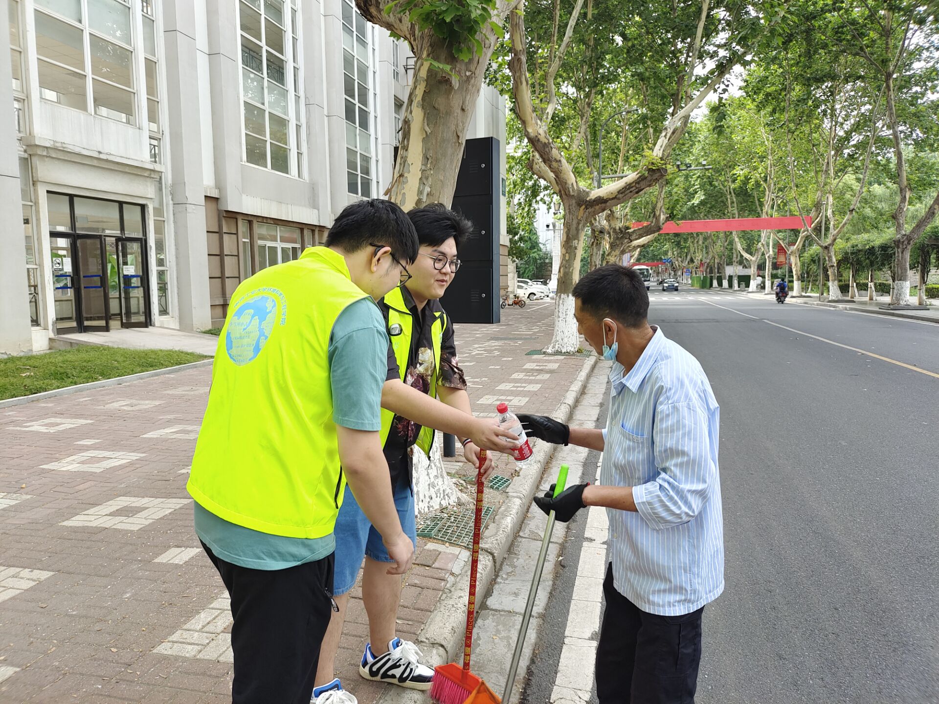 早上六点半,志愿者们身穿绿色马甲于北苑食堂门口集合。随后,志愿者们分成两个小队,在各队负责人的带领下,从北苑食堂出发,途径亚青、西苑、南苑、东苑、浦江等校园各个区域,看到环卫工人劳累的身影,志愿者们连忙上前送上准备好的矿泉水、主动为他们扇风驱暑。志愿者们与环卫工人们就校园防疫和垃圾分类现状进行了深入的交流,并向他们致以真诚的感谢和问候,对他们的敬业奉献精神表示崇高的敬意。“谢谢!”是志愿者们和环卫工人之间说的最多的一句话。志愿者们谢谢环卫工人为校园环卫的辛苦付出;环卫工人们也感谢志愿者们在这炎热的天气送水,更感谢伟德betvlctor1946源于英国对环卫工作的理解。