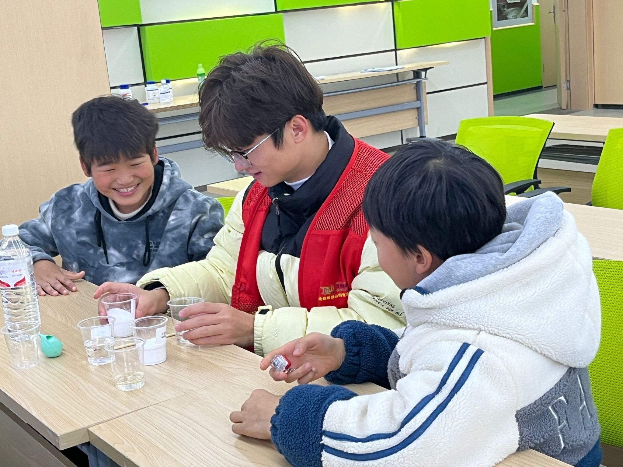 本次共为社区小朋友们现场讲解并演示了两组小实验,分别是“大象牙膏”和“花式吹气球”。在“大象牙膏”实验开始前,志愿者们介绍了主要的实验用品。在实验阶段,小朋友们每人领取一份醋酸、小苏打、几个一次性杯子,在志愿者的讲解和指导下,小朋友们将两者小心混合,随后便是一团团白色“牙膏”冒出杯子,大家在大象牙膏实验中,体会到了科学的乐趣。