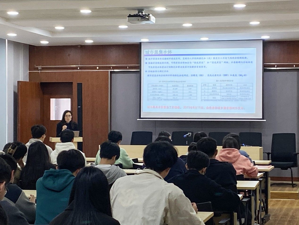 高燕老师根据河道水体生态环境治理的现实需求,将河道水体生态修复技术标准制定进行了必要性分析,列举并详细解析国内外相关标准制定的发展趋势以及河流生态修复措施及工程技术。之后,师生之间就河道治理问题进行了充分交流。