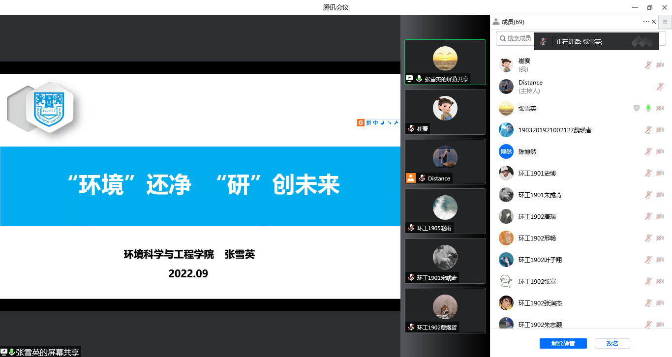 2022年9月26日,环境科学与工程学院召开2023年考研动员大会,学院副院长张雪英、2019级考研学生代表、2020级拟考研学生等人员通过线上方式参加了本次会议,会议由副院长张雪英教授主持。