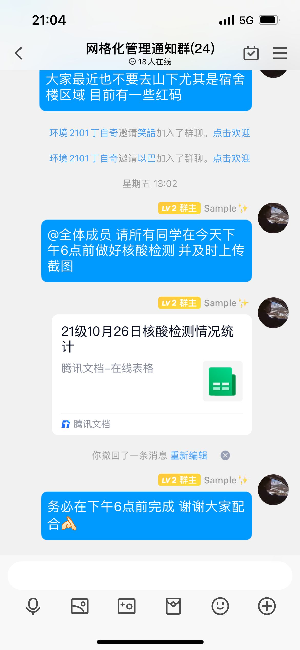 按照学校部署,在每一栋宿舍楼设立楼长、在每一层设立层长、同时设置网格员,学生党员、主要学生干部主动承担楼长、层长、网格员等职务,对所负责区域同学建立工作群,精准掌握同学们的核酸检测情况,协调解决同学们的在学习及生活上的问题,充分发挥了学生党员及学生骨干的积极作用。