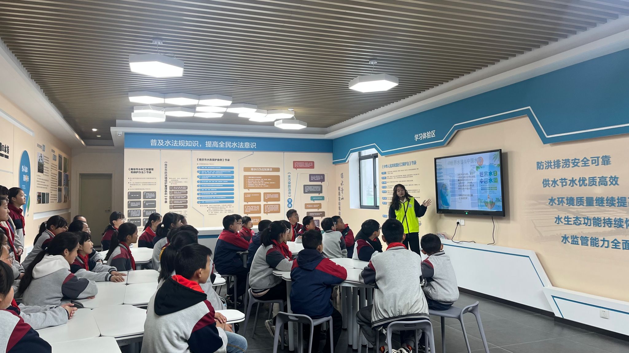 环境科学与工程学院“河小青”环保志愿服务队面向浦口区车站小学学生上了一堂以“水滴汇成大海,节水护水从我做起”为主题的水情节水教育公开课,课上我院志愿者为小学生们讲授了我国的基本水情、水法律法规以及日常生活中的节水护水常识,开展了水相关实验体验以及科普互动环节。课后,环境科学与工程学院“河小青”环保志愿服务队和浦口区水务局“浦小清”志愿者在滁河水利文化馆共同参观了滁河历史文化发展展览以及当代滁河治理成果。