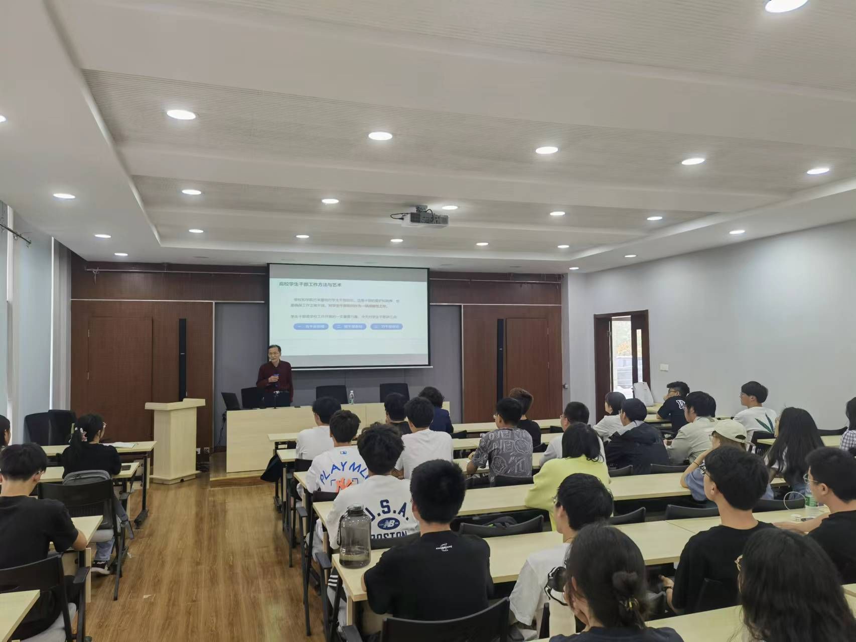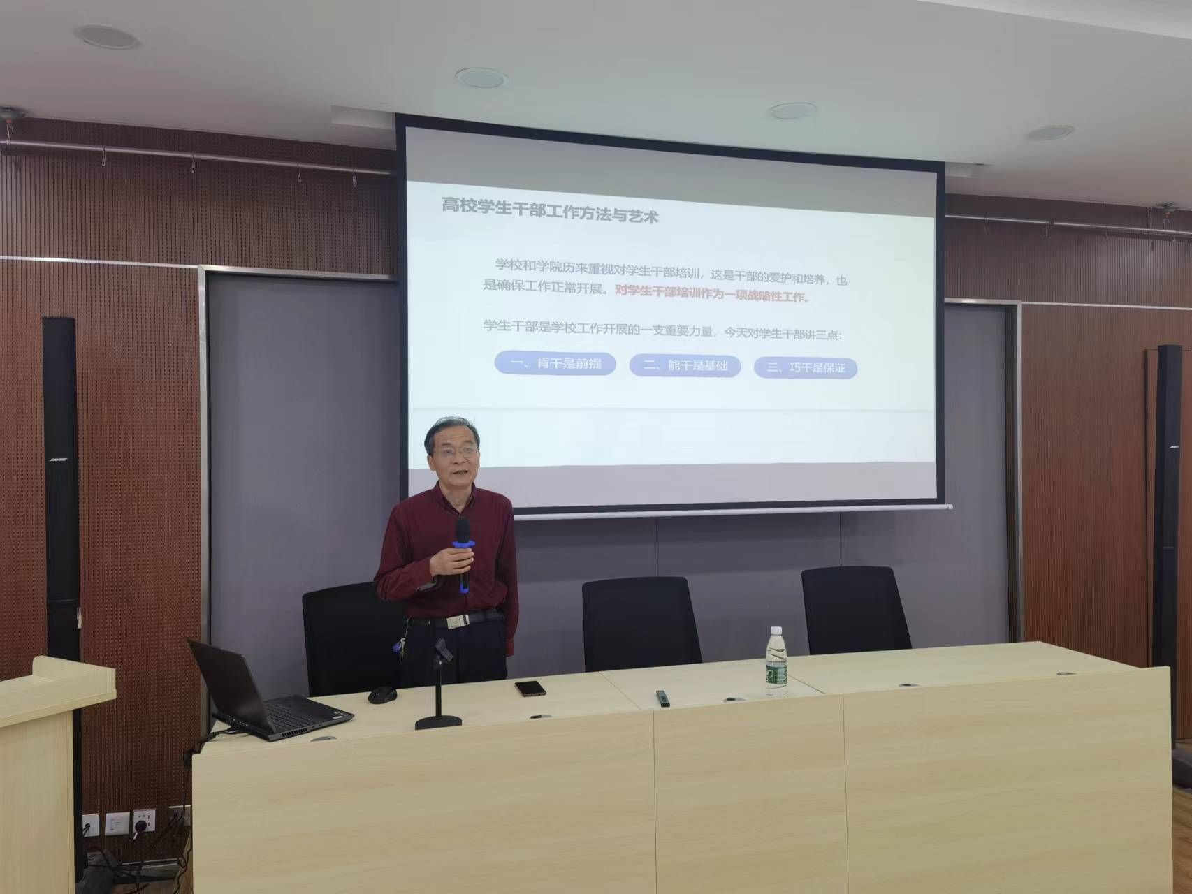 陈建华书记围绕“高校学生干部工作方法与艺术”主题,结合学生干部成才发展路径对党的二十大报告进行深入解读,同时强调学生干部“肯干是前提,能干是基础,巧干是保证”,指出学生干部要练就“四把刷子”,做到“四心合一”,在工作的岗位上不断地实践,为学校建设和发展、为自己和国家的前途和命运做出积极贡献。