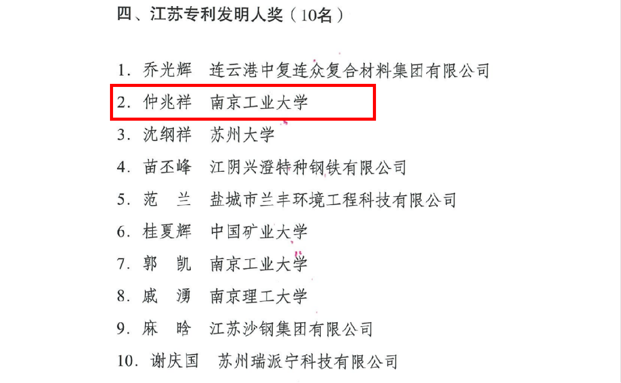 近日,江苏省人民政府发布了《省政府关于公布首届江苏专利奖的决定》(苏政发[2023]47号),首届江苏专利奖共评选出项目类专利奖77项,专利发明人奖10人。我院仲兆祥教授荣获江苏专利奖发明人奖。