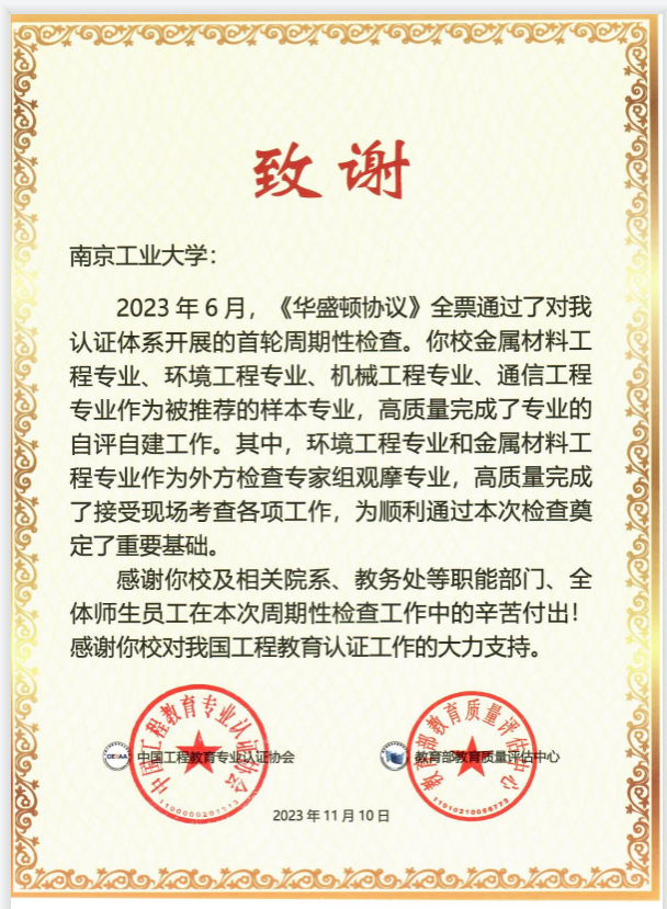 近日,我院环境工程专业喜获殊荣,收到了中国工程教育认证协会及教育部教育质量评估中心的致谢函。此份致谢函充分肯定了我院环境工程专业在《华盛顿协议》首轮周期性检查中,以高质量完成专业的自评自建工作。致谢函明确指出,我院环境工程专业作为外方检查专家组观摩专业,高质量完成了接受现场考察各项工作,为顺利通过本次检查奠定了重要基础。