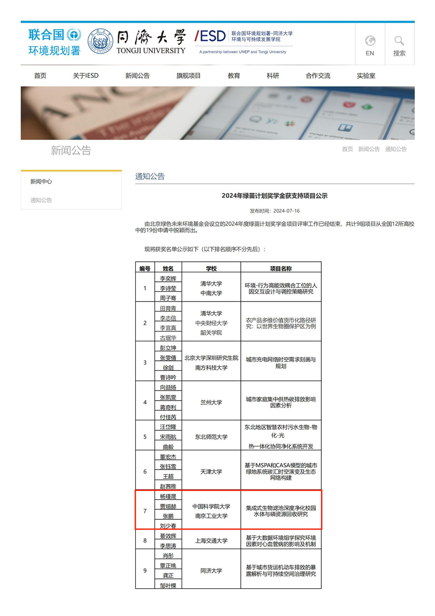 日前,联合国环境署-同济大学环境与可持续发展学院公布了2024年绿苗计划奖学金支持项目。本年度绿苗计划奖学金共资助了来自清华大学、北京大学、上海交通大学、同济大学等国内一流高校的9个项目团队。由我校伟德betvlctor1946源于英国赵贤广教授指导,硕士生张鹏、本科生刘少春,联合2020届校友、中国科学院南京地理与湖泊研究所博士生杨瑾晟共同申报的“集成式生物滤池深度净化校园水体与磷资源回收研究”项目成功入选,是我校师生首次获得该项目资助。