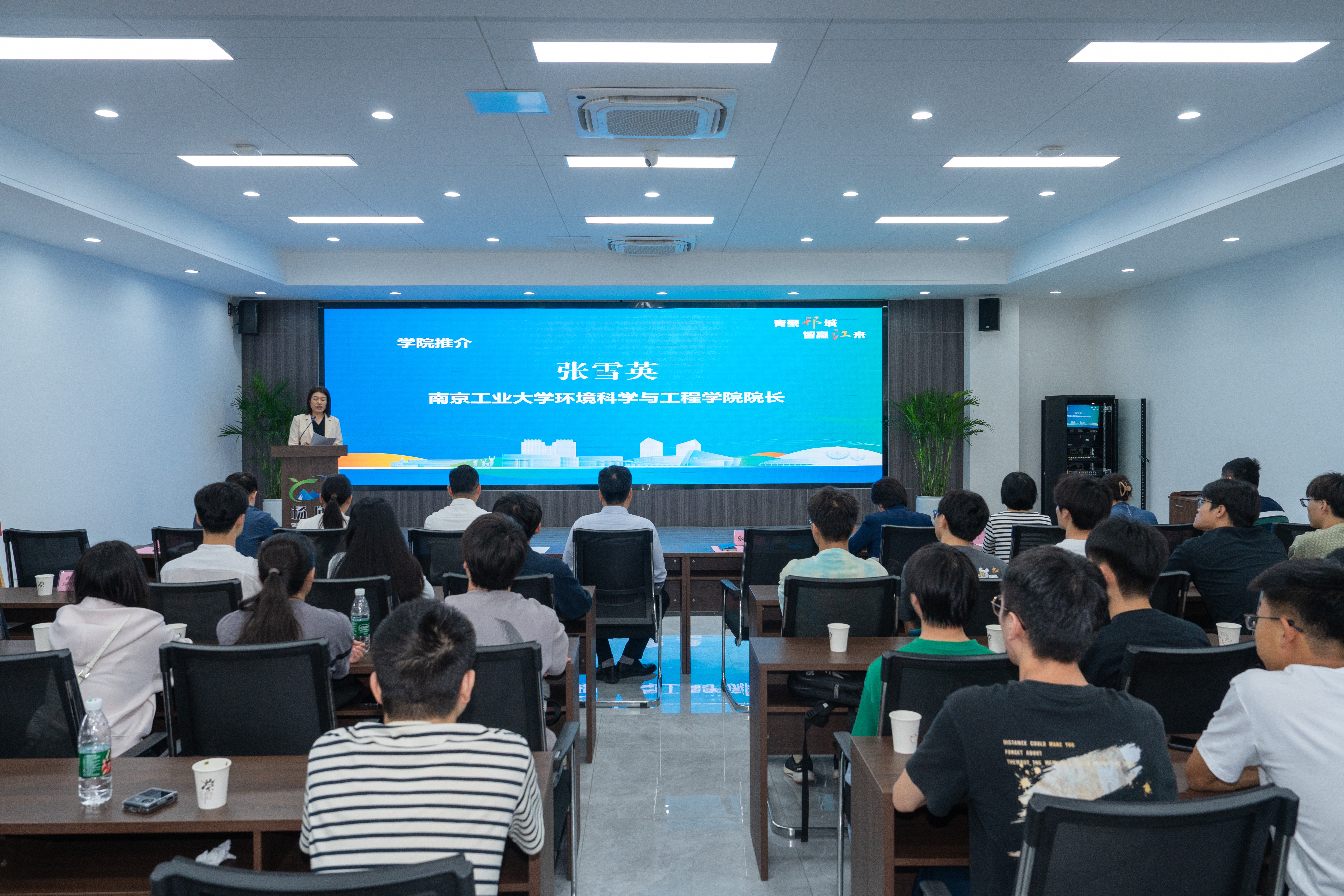 在人才产业交流对接会上,杜垒介绍了杨庙镇与产业园的基本情况,并向师生们发出“来邗邀约”;区高层次人才创新创业促进中心副主任陈晨介绍了邗江区人才政策。张雪英介绍了学校学院发展历史与现状,并重点介绍了学院学科专业特色、产学研合作优势并回顾了与邗江区的合作基础,她指出双方合作是优势互补、共赢未来的重要契机,要共同打造人才引育新高地,构建“现象级”产学研共同体,服务区域绿色发展大局。此外,徐宽兴与团区委副书记陈尧为“邗江青年城市推荐官”颁发聘书,张莼波与杜垒共同为伟德victor1946—扬州环保科技产业园就业创业实习实践基地揭牌。