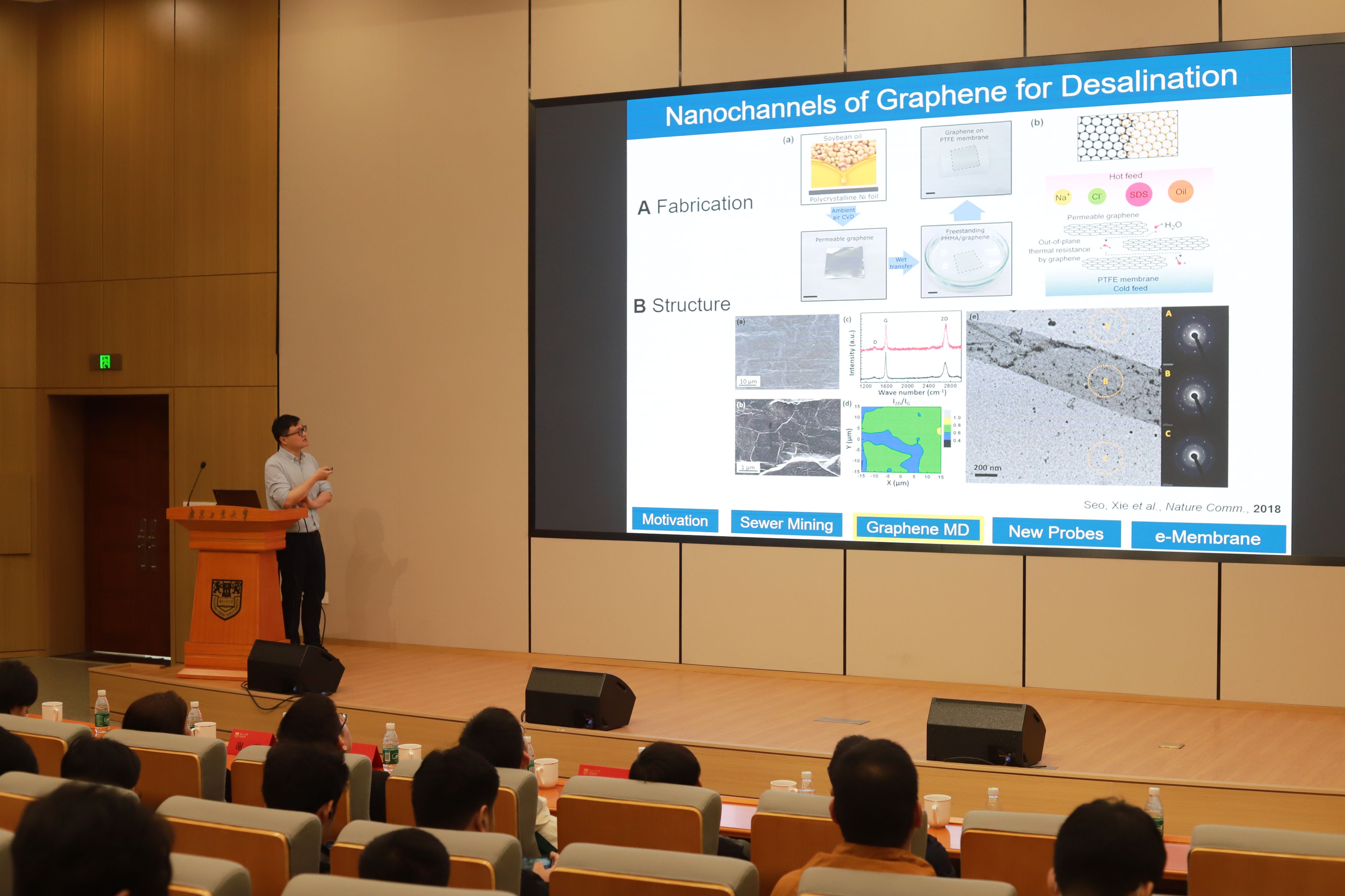 谢明首先从自己在母校的学习经历讲起,以及博士和博后阶段的求学历程,到现今的科研与教学工作,系统回顾了个人发展的主要阶段与研究方向的逐步凝练过程,为本科生和研究生学弟学妹们作了很好的学习规划和职业生涯规划分享。随后,谢明结合自身长期从事膜材料研究的经验,围绕膜材料的制备方法、结构调控及其应用场景进行了深入阐述,并介绍了近年来发表于Nature Water等高水平期刊的一系列代表性研究成果,介绍了膜材料在水处理、资源循环利用和绿色分离过程中的应用。