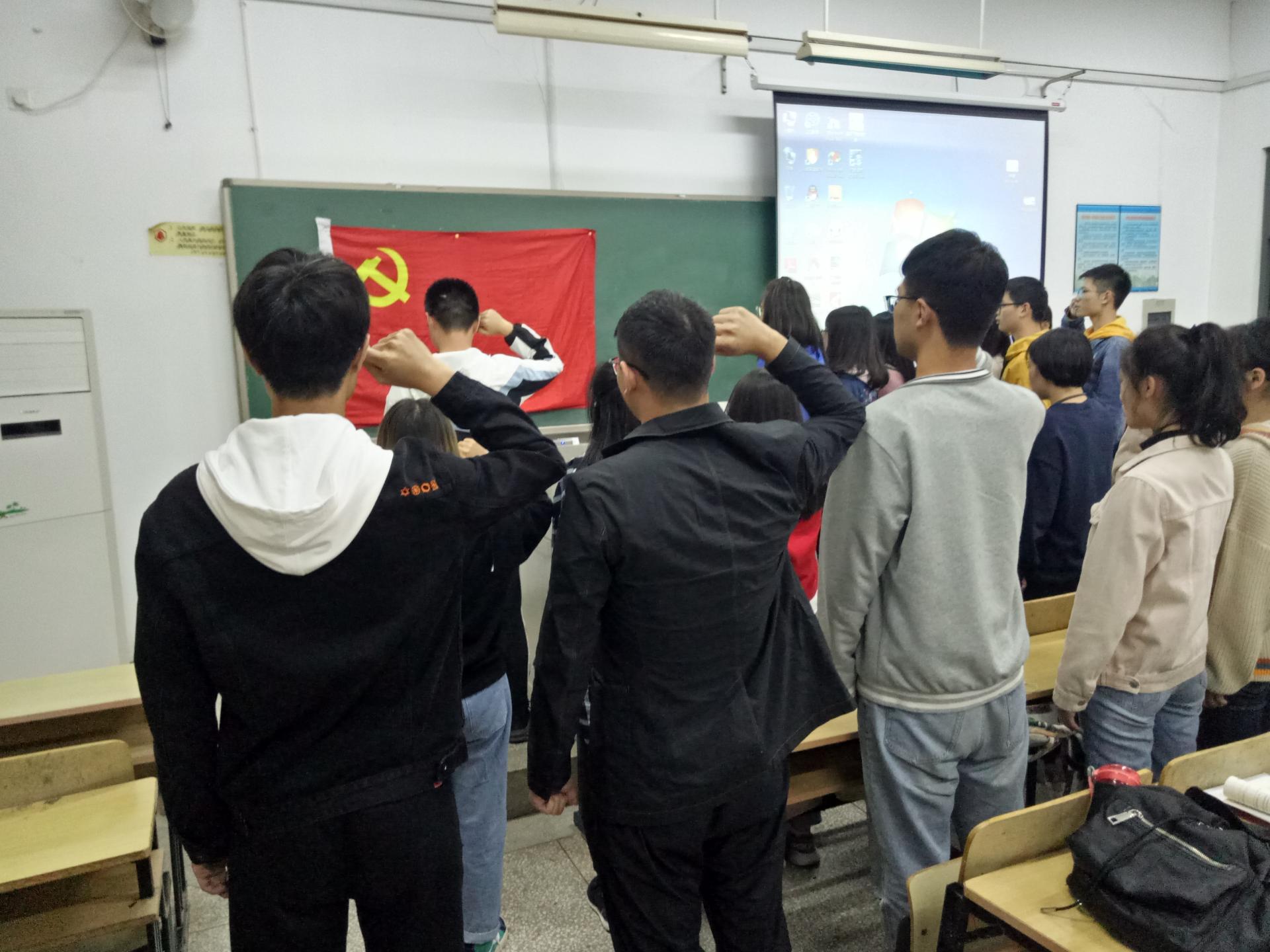 最后,全体党员庄严地面对党旗,举起右拳,重温入党誓词。