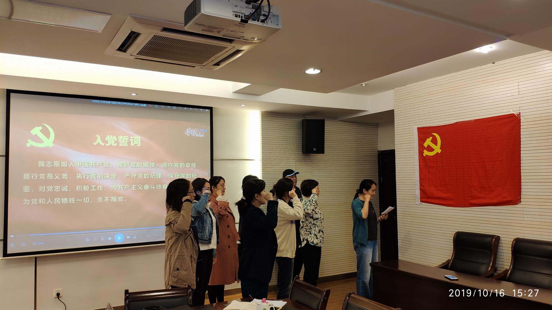 活动中,党支部书记蒋皎梅老师带领全体党员学习了《习近平新时代中国特色社会主义思想学习纲要》,观看视频《忠诚》、《孤岛32年》以及赵亚夫事迹报道片,党员们接受了一次心灵的洗礼。随后,党支部全体党员进行重读入党志愿、重忆入党经历、重问入党初心,大家结合自己学习和工作经历,谈初心、话使命、谈奋斗,各抒己见,气氛热烈。最后,在“学习强国”原创微视频《我宣誓》的感召下,党支部全体党员举起右拳,面对党旗庄严宣誓,一起重温入党誓言,坚定信念,不忘初心。