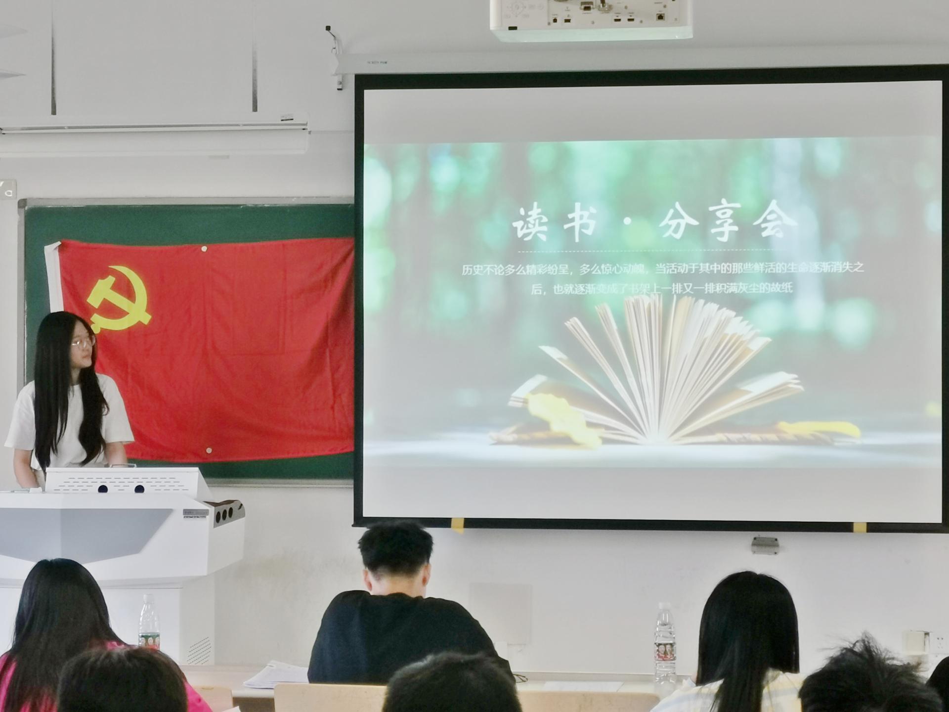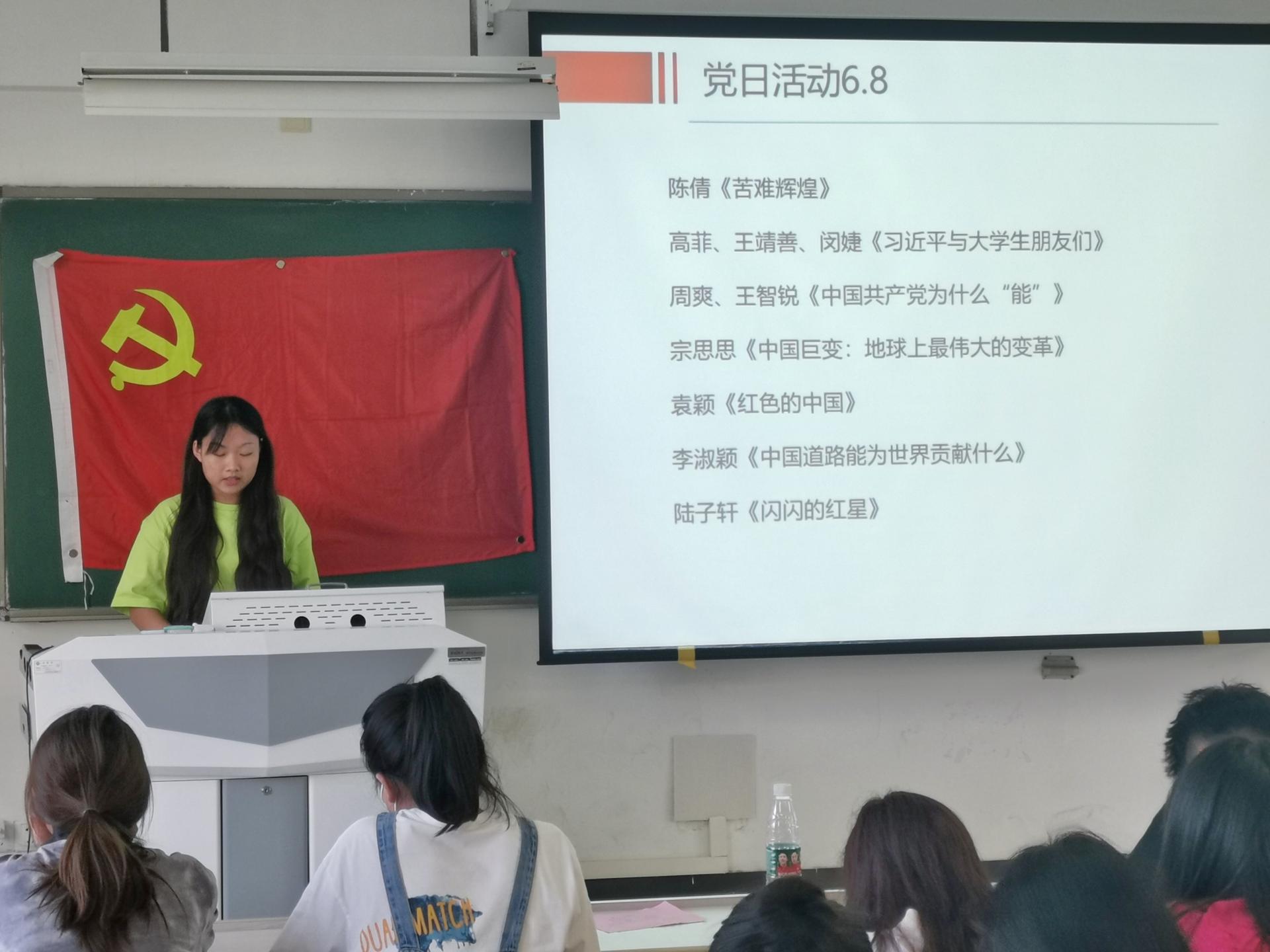 本次活动分为两个阶段,在4月—5月安排支部全体党员进行前期读书学习,要求同学们充分利用课余时间阅读“红色经典”书籍,并撰写读书报告。6月评选出优秀读书报告10份并开展“红色经典读书分享交流会”,由十位党员同学向大家分享自己的读书心得。读书分享现场,气氛活跃,党员代表积极分享红色经典著作,分别对《苦难辉煌》、《习近平与大学生朋友们》、《中国共产党为什么“能”》、《中国巨变:地球上最伟大的变革》、《红色中国》、《中国道路能为世界贡献什么》、《闪闪的红星》等书籍进行了荐读分享,并诵读了书中精心挑选的经典节选,分享的过程有力地促进了支部党员在读书中学习,在学习中成长,营造了良好的学习氛围。活动最后,支部副书记陈倩强调,在迎接党的二十大的重大时刻,通过常态化、长效化开展党史学习教育和“红色经典读书分享交流活动”,目的提高支部全体党员学习党的理论的积极性,通过红色经典书籍的学习,不断地汲取奋进力量,以优异的精神面貌,喜迎二十大。