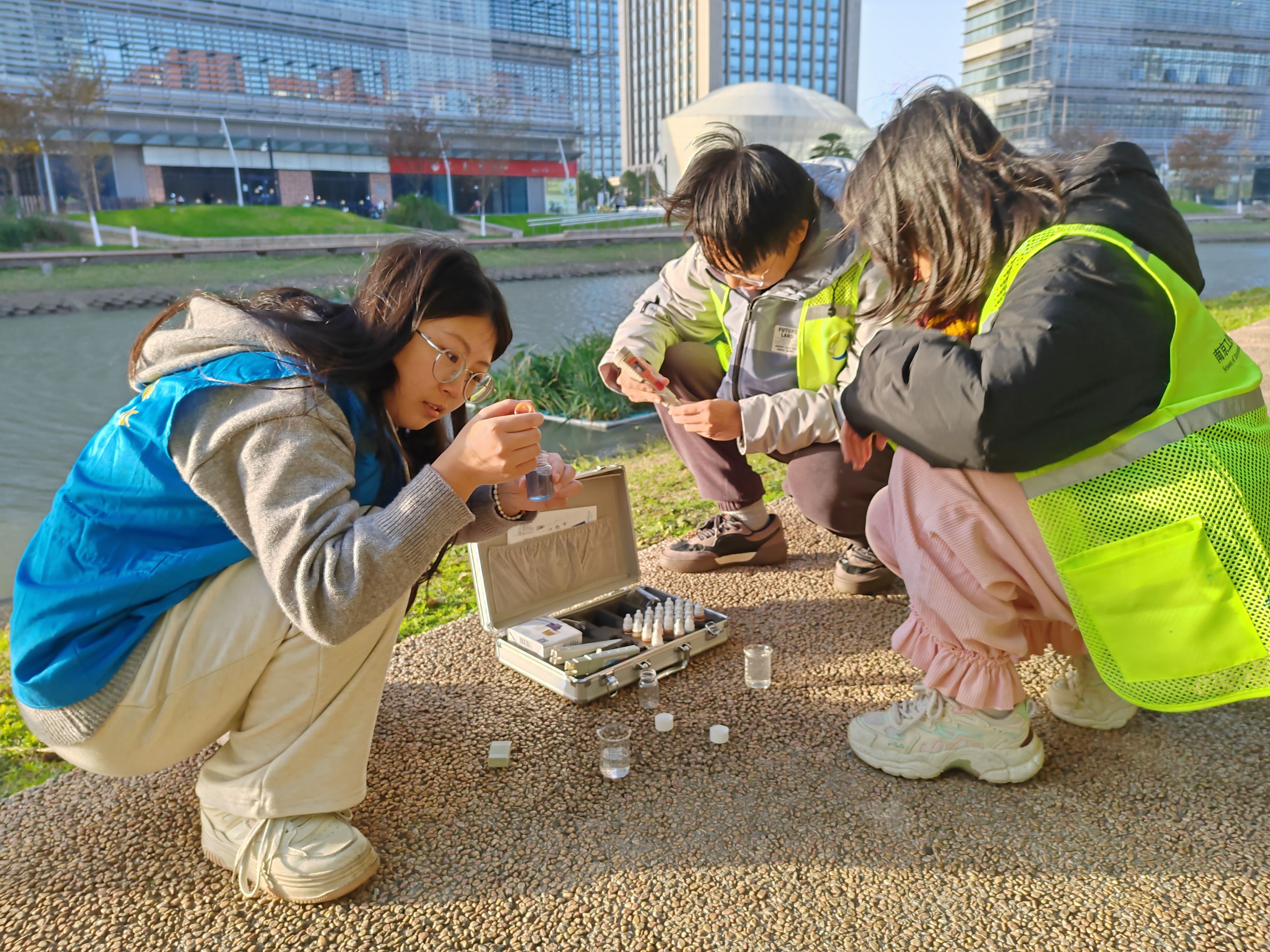 活动伊始,支部成员与江东街道城管执法中队队员、城市治理公众委员一行前往下圩河附近开展护河志愿服务。中队队员详细介绍了他们日常巡河的工作流程和注意事项,为参与活动的每一个人提供了宝贵的知识分享。随后,支部成员动手实践,对下圩河进行了水样的采集工作。他们利用快速水质检测剂,对河水中的氨氮浓度、磷酸盐浓度、溶解氧、pH值以及总溶解固体(TDS)等关键指标进行了测量,结果显示下圩河水质良好。在这个过程中,支部成员们不仅将所学运用到实践中,增强专业认同感与自豪感,而且亲身感受到南京水环境治理的卓越成效。
