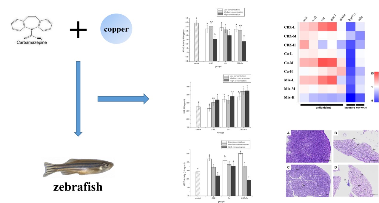 卡马西平(CBZ)作为一种新型污染物在世界各地水体中被频繁检出,有关它在环境中的生态毒理效应广受关注。然而,关于CBZ和环境中其它污染物的联合毒性,仍为阐明。为了探讨环境浓度的CBZ和常见的Cu2+对水生生物的联合毒理效应,我院张永军和何益得团队以斑马鱼为受试生物,通过相关生物标志物,深入研究了两种污染物对斑马鱼抗氧化系统及神经系统的毒性效应,并通过qPCR技术及组织病理学技术进行了验证。实验结果表明,水体环境中共存的CBZ及Cu2+对斑马鱼体内的抗氧化系统毒性效应产生加和作用,qPCR结果及对斑马鱼肝脏组织的病理学分析结果证明了这一点。有趣的是,与单一暴露的毒性相比,共暴露对斑马鱼的神经系统毒性影响不大。本研究显示,在实际情况中,用单一暴露的毒理学结果外推共暴露的毒理学结果并不可靠,需要从事更多的共暴露毒理实验研究。