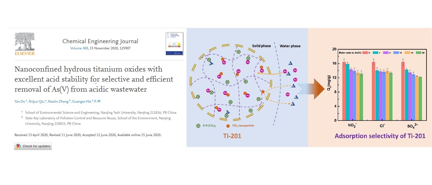 研究成果“Nanoconfined hydrous titanium oxides with excellent acid stability for selective and efficient removal of As(V) from acidic wastewater”于2020年6月12日被工程技术类知名SCI期刊Chemical Engineering Journal接收,并于近日在线发表。该文第一作者为我院18级硕士生杜妍,通讯作者为聂广泽老师,19级硕士生仇世俊和南京大学张孝林副教授为共同作者。该工作得到了国家自然科学基金、国家重点研发计划和南京大学污染控制与资源化研究国家重点实验室开放课题的资助。