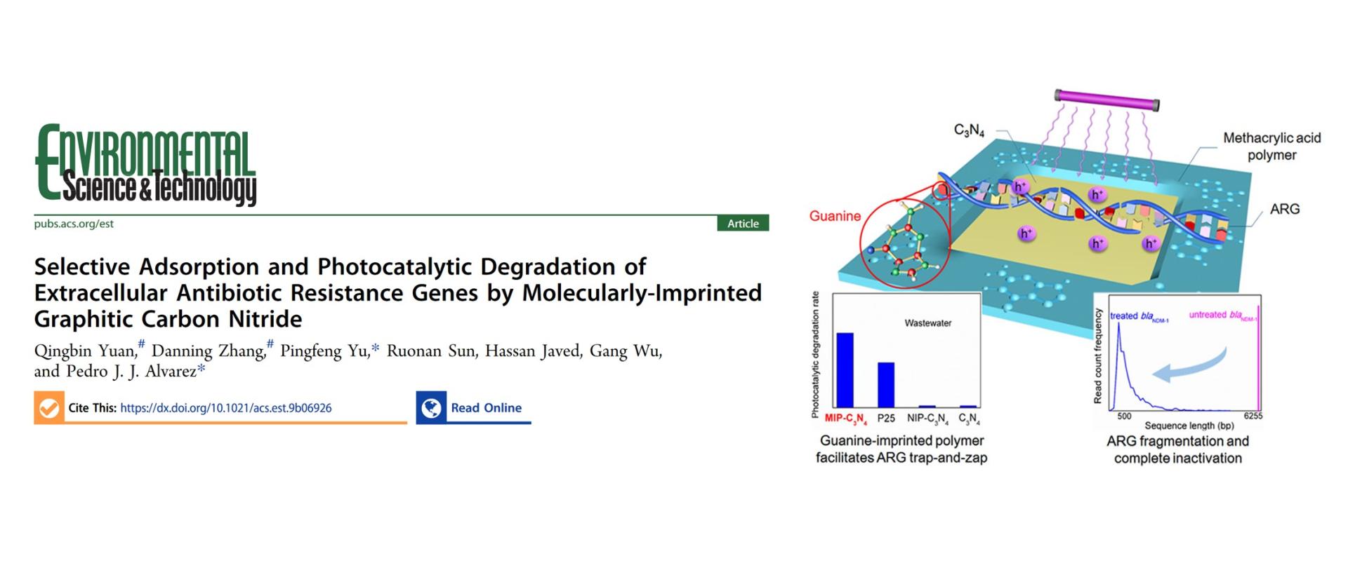我院袁青彬老师和莱斯大学Alvarez J.J. Pedro教授合作,利用分子印迹能够选择性识别污染物的特征,开发了基于DNA分子印迹的抗性基因选择性光降解技术。本项目将DNA分子印迹负载到非金属和环境友好的C3N4光催化材料表面,能够选择性地识别抗性基因,经过紫外光(360nm)降解30min即可降解超过99.9%的抗性基因,在模拟污染物和实际污水中均表现出良好的选择性。此外,负载DNA分子印迹的C3N4还有效地实现抗性基因片段化降解,从而避免了抗性基因的再修复和重新表达。该技术为城市污水等环境中抗药性的控制提供了新思路。