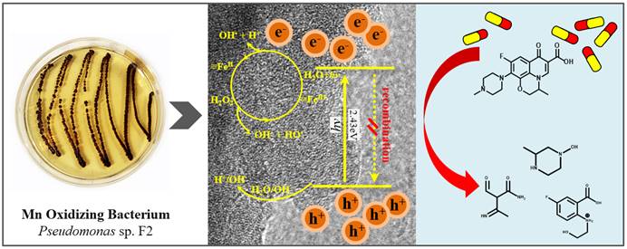 我院张永军教授课题组利用锰氧化细菌Pseudomonas sp. F2 制备得到了具有高催化性能的生物铁锰氧化物(bio-FeMnOx),其制备过程具有操作简易、成本低廉以及环境友好等特点。研究表明该催化剂含有γ-Fe2O3以及混合价态的锰元素,并具有较低阻抗值和较宽的吸收光谱,能够降低表面电子空穴对的重组,从而进一步产生高活性的自由基,有效降解水体中氧氟沙星,并且实验证明处理后氧氟沙星溶液的生物呼吸抑制率降低了约50%。该研究首次将生物制备的催化剂bio-FeMnOx应用于光芬顿过程中,为光芬顿催化剂的制备提供了新思路。