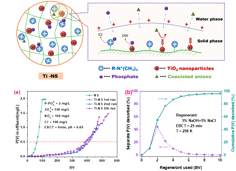 近期纳米钛氧化物因其对磷酸盐具备特异性吸附能力受到广泛关注,但其在含磷废水常见的中性pH范围吸附量较小,同时超细的颗粒尺寸使其在应用于间歇式或连续式水处理系统中存在压降大、难以固液分离的难题。针对这一技术瓶颈,我院聂广泽老师课题组通过将纳米钛氧化物分散到大颗粒的带有丰富正电荷的高分子聚合物载体(NS)内,研制了一种毫米级尺寸的钛基纳米复合材料Ti-NS。该复合材料具备两种类型的吸附位点,即载体上的正电荷基团和孔道内的钛氧化物纳米颗粒,可分别通过静电作用和表面络合作用去除水中的磷酸盐,且载体骨架上不可扩散的正电荷产生的Donnan膜效应,可对水中磷酸盐离子产生预富集和强化扩散作用。研究结果表明Ti-NS在中性pH范围具备最佳的吸附容量,同时表现出了快速的吸附动力学特性和优异的吸附选择性。固定床循环吸附实验进一步证实Ti-NS对模拟废水和实际废水均具备较高的处理容量,吸附饱和后的吸附剂可用NaOH-NaCl进行有效再生,再生后吸附剂的处理能力几乎没有损失,表明吸附剂具备良好的循环使用性能。