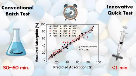 我院张永军教授团队和柏林工业大学Martin Jekel教授团队合作,共同开发出了操作时长少于1分钟,仅使用紫外分光光度计的快速测试方法。经过对比快速检测法和常规吸附法去除废水中背景有机物的效率、两个方法去除废水中UV254和选定的14种常见新兴污染物的关联,最终确定了快速检测法去除废水中UV254和常规吸附法去除废水中12种新兴污染物之间的强关联性。使得常规吸附法去除新兴污染物的效率,通过使用快速检测法,在不到1分钟的操作和仅使用紫外分光光度计作为检测手段下,得到准确的预测。