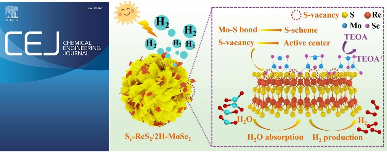 我院徐海涛教授团队联合澳大利亚阿德莱德大学Shaobin Wang教授、Xiaoguang Duan研究员在国际著名期刊《Chemical Engineering Journal》(IF=16.744, 一区)上发表题为“Edge-enriched laminar hexagonal (2H) MoSe2-anchored sulfur vacancies-rich ReS2 nanoflowers for boosted light-to-hydrogen conversion”研究论文。在团队近期工作(Chem. Eng. J. 2023, 460141849)基础上,通过缺陷诱导化学键合界面的产生,以加强内建电场,从而构筑可保留催化剂本征强氧化还原能力的新型S型异质结。机理解析表明,界面Mo-S键促进光生载流子的分离和定向迁移以高效抑制电子和空穴的重组,并建立了空间隔离的氧化还原中心,进而获得优异的光解水制氢效果。